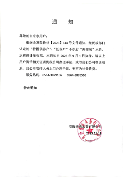 關(guān)于弱勢(shì)群眾生活用水價(jià)格收取的通知