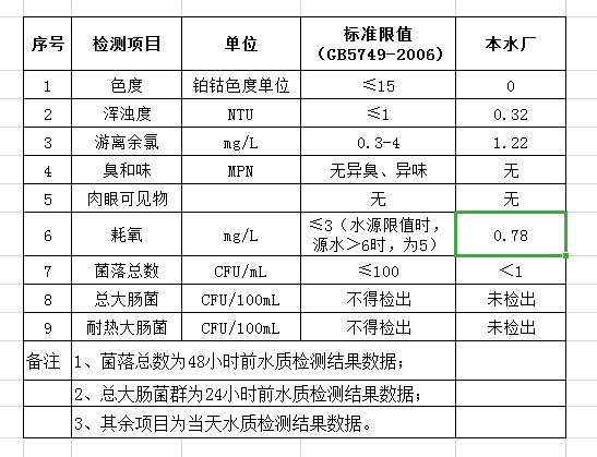 先生店水廠2019年12月4日出廠水水質(zhì)公告