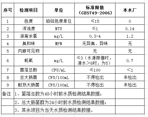 先生店水廠2019年12月25日出廠水水質(zhì)公告