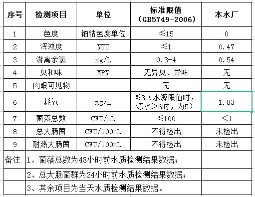 先生店水廠2021年7月19日出廠水水質(zhì)公告